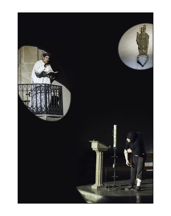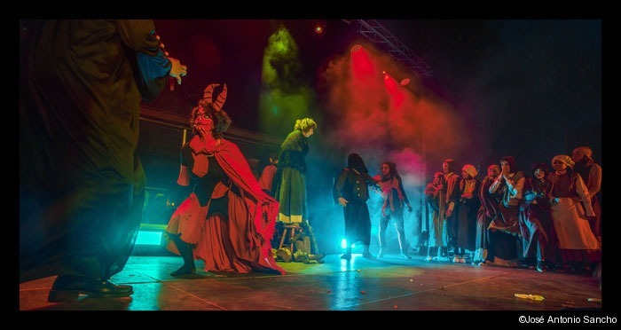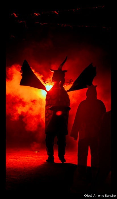 La exposición la he dividido en 7 espacios: Los espacios 1 y 2 forman una instalación a modo de caseta de feria y gira en torno al fuego, con referencias a un imaginario de diablos, bestias, fiesta y sacrificio. En contraposición tenemos el espacio 3 asociado a la liturgia, la consagración y al consuelo de las almas, en el que las bendiciones y los cantos corales envuelven la atmósfera junto con el incienso y el repicar de campanas, en un intento de ahuyentar los malos espíritus.